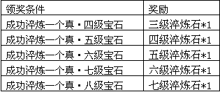 活动期间,玩家每淬炼成功一个指定级别的真·宝石,即可获得系统赠送的好礼一份。