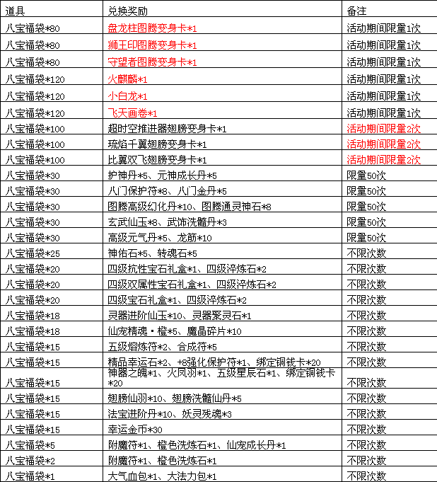 活动期间,每消费300元宝即可获得八宝福袋*3,集齐一定数量的【八宝福袋】可在活动相应面板兑换超值奖励哦!