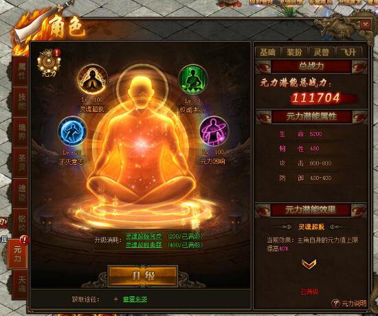 消耗对应材料升级潜能可获得属性,达到一定等级可激活潜能的特殊效果