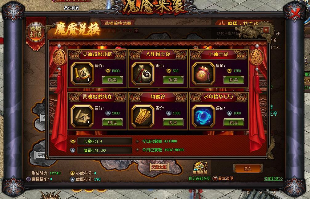 积分可用于【魔魇来袭-魔魇商城】中购买灵魂超脱典籍、灵魂超脱残卷等道具