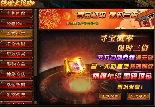 1.活动期间,玩家寻宝概率翻倍,极高几率获得星·太初首饰,混元砂,传世灵器、传世灵甲,元力回响典籍、元力回响残卷,雷霆左镯以及雷霆项链