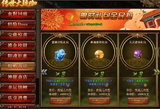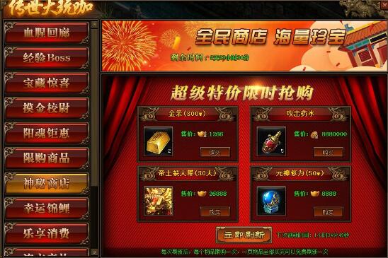 1.活动期间,玩家可在神秘商店中购买商品,商品可用金币,绑元,元宝进行购买;
