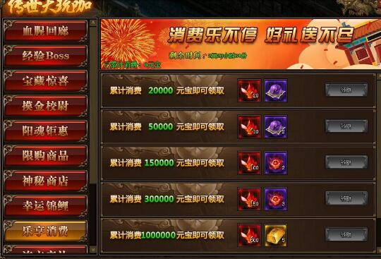 1.活动期间,玩家累计消费满足要求,可以领取境界修为、本职业星石、传世灵戒等相应奖励;