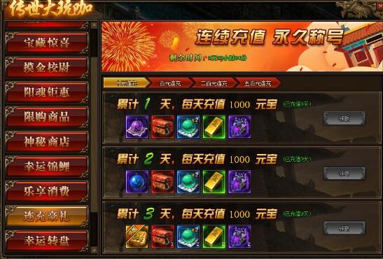 1.活动期间,每天充值10元、100元、200元、500元可领取境界修为、特戒礼盒。