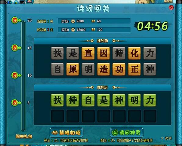 ②点击“排序前”诗词将其排列好,即为闯关成功并进入下一句诗词的闯关,过程中可使用“慧眼如炬”(只能用1次)和“请仙问灵”(只能用3次)两种锦囊;