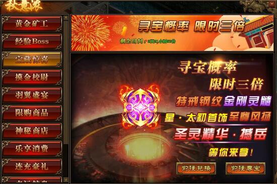 1.活动期间,玩家寻宝概率翻倍,极高几率获得星·太初首饰,特戒钢纹,仙元石、碧落星空,金刚灵髓,至尊风扬阵法以及圣灵精华·憾岳