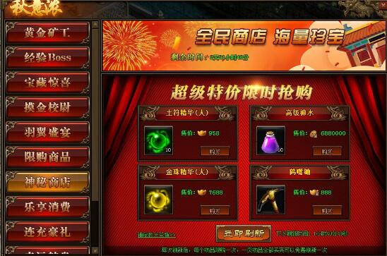 1.活动期间,玩家可在神秘商店中购买商品,商品可用金币,绑元,元宝进行购买;