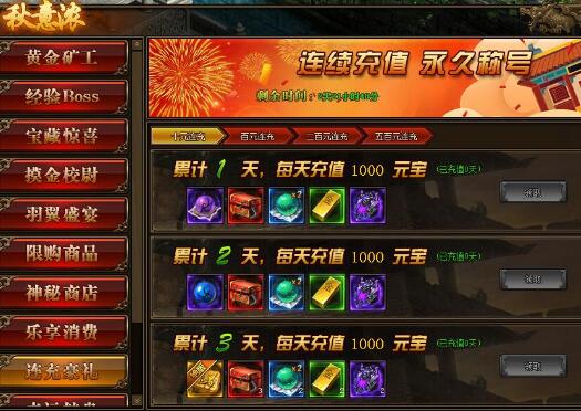 2.累积充值达到三天,奖励翻倍领,更可领取稀有称号(称号可淬炼)!