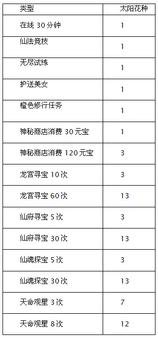 1.活动期间,玩家完成以下指定游戏内容可获得太阳花种,不同数量太阳花种可兑换不同级别的太阳花;