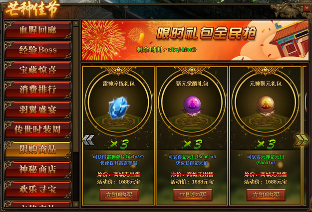 1.活动期间,玩家可在活动面板购买限购商品;(可翻页)