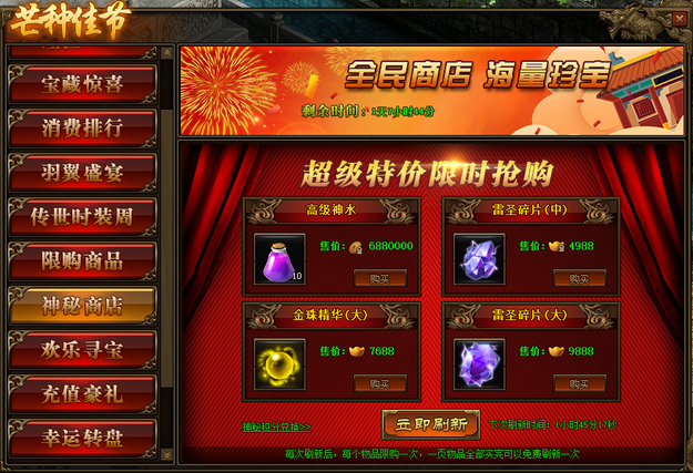 2.神秘商店每2小时自动刷新一次,也可用花费元宝立即刷新;