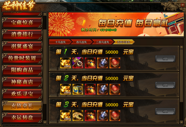 2.连续充值达到3天,奖励翻倍领,更可领取暗影晶石、地狱晶石、随机7级阵法宝珠、雷霆装备等贵重物品