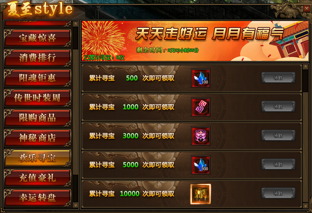 1.活动期间,玩家累计寻宝次数满足要求,可以领取本职业星石、高级仙装、仙装灵器等相应奖励;