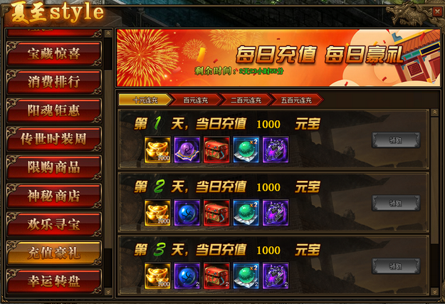 2.连续充值达到3天,奖励翻倍领,更可领取暗影晶石、地狱晶石、雷霆装备等贵重物品