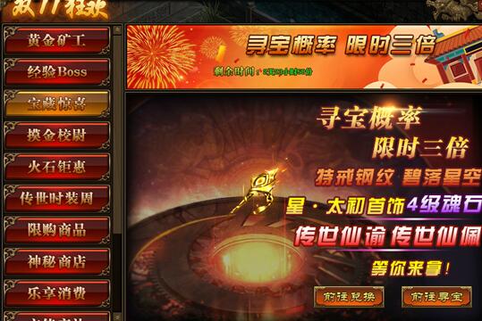 1.活动期间,玩家寻宝概率翻倍,极高几率获得星·太初首饰,传世灵器、传世灵甲,特戒钢纹,仙元石、碧落星空,传世灵器、传世灵甲,高级天魂石、四级魂石,传世灵器·仙谕以及传世灵器·仙佩