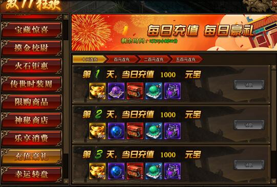 2.连续充值达到3天,奖励翻倍领,更可领取暗影晶石、地狱晶石、觉醒晶石等贵重物品