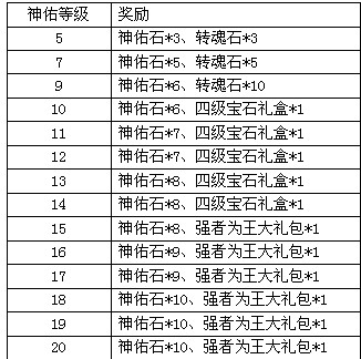 活动规则:活动期间,将任意装备神佑提升到指定等级,可获得额外系统赠礼。