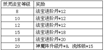 活动规则:活动期间,将灵戒洞天里任意妖灵法宝等级提升到指定等级,可获得额外系统赠礼。