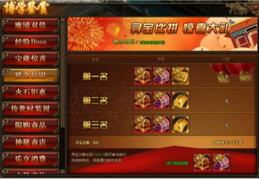 第三名:名列前茅自选宝箱,传世灵器随机宝箱*1,金条(300w)*2;