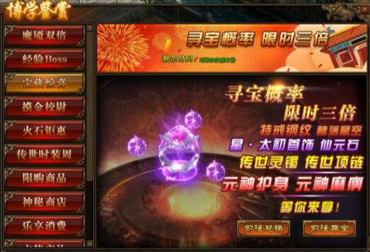 1.活动期间,玩家寻宝概率翻倍,极高几率获得星·太初首饰,特戒钢纹、仙元石、碧落星空,传世灵器、传世灵甲,传世灵器·手镯碎片、传世灵器·项链碎片,元神麻痹特戒以及元神护身特戒