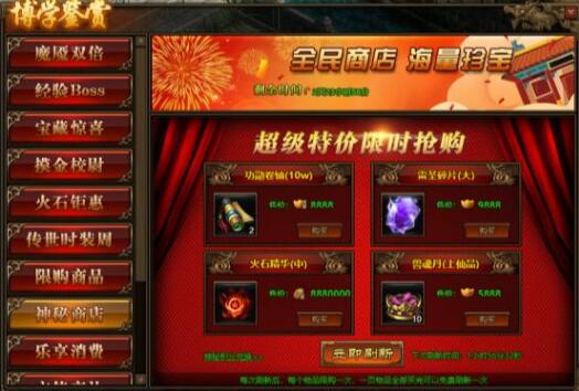 1.活动期间,玩家可在神秘商店中购买商品,商品可用金币,绑元,元宝进行购买;