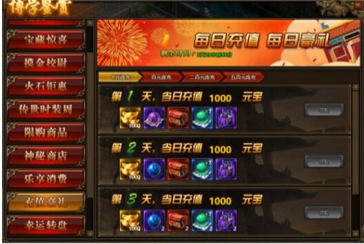 2.连续充值达到3天,奖励翻倍领,更可领取暗影晶石、地狱晶石、随机阵法宝珠宝箱等贵重物品