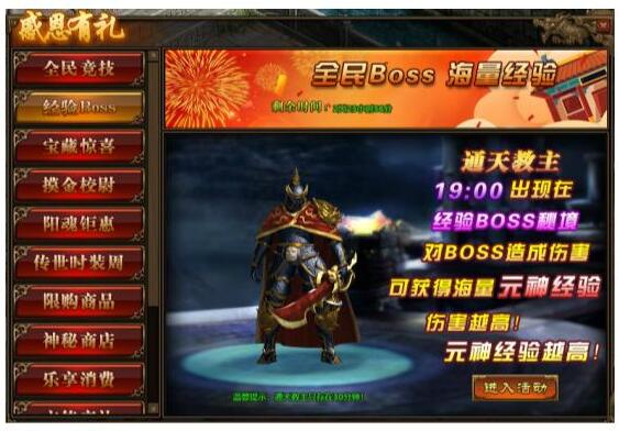 2.活动中,玩家对BOSS造成的伤害,将在活动结束后转换成元神经验并发放; 3.提示:可使用攻击药水,暴击药水的药品来获得更高的伤害,更多的经验;