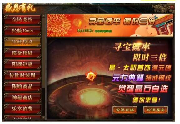 1.活动期间,玩家寻宝概率翻倍,极高几率获得星·太初首饰,传世灵器、传世灵甲,特戒钢纹,混元砂,传世灵器、传世灵甲,不灭意志典籍、元力回响典籍以及觉醒晶石自选宝箱