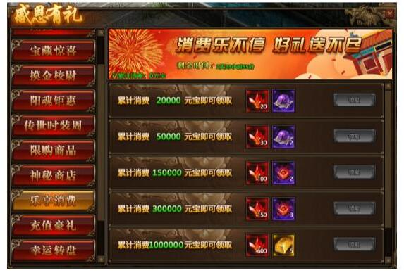 1.活动期间,玩家累计消费满足要求,可以领取境界修为、本职业星石、传世灵戒等相应奖励;