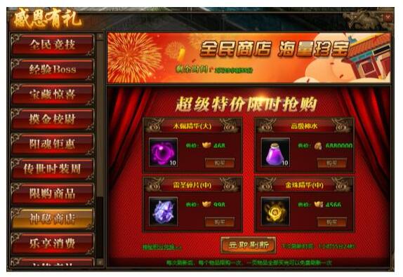 1.活动期间,玩家可在神秘商店中购买商品,商品可用金币,绑元,元宝进行购买;