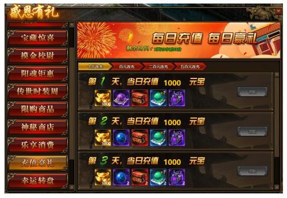 2.连续充值达到3天,奖励翻倍领,更可领取暗影晶石、地狱晶石、雷霆装备等贵重物品