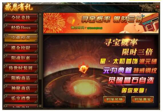1.活动期间,玩家寻宝概率翻倍,极高几率获得星·太初首饰,传世灵器、传世灵甲,特戒钢纹,混元砂,传世灵器、传世灵甲,不灭意志典籍、元力回响典籍以及觉醒晶石自选宝箱