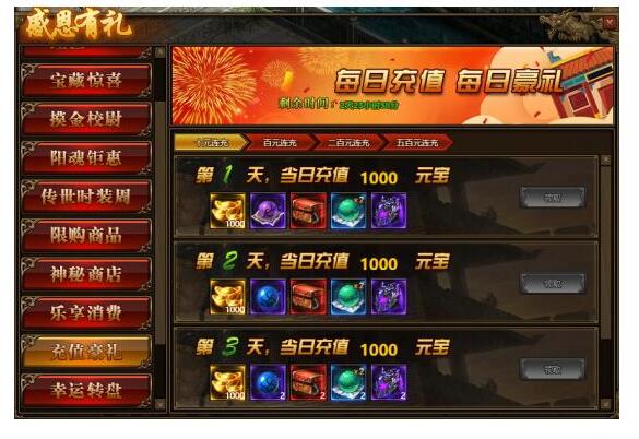 2.连续充值达到3天,奖励翻倍领,更可领取暗影晶石、地狱晶石、雷霆装备等贵重物品