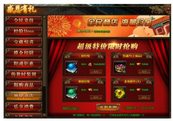 1.活动期间,玩家可在神秘商店中购买商品,商品可用金币,绑元,元宝进行购买;