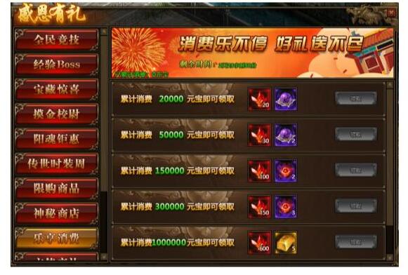 1.活动期间,玩家累计消费满足要求,可以领取境界修为、本职业星石、传世灵戒等相应奖励;