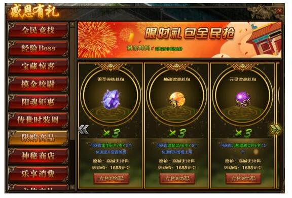 1.活动期间,玩家可在活动面板购买限购商品;(可翻页)