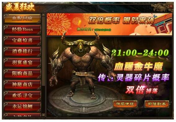 1.活动期间,玩家参与“多人副本-血腥回廊”,获得“传世灵器碎片”的概率翻倍;