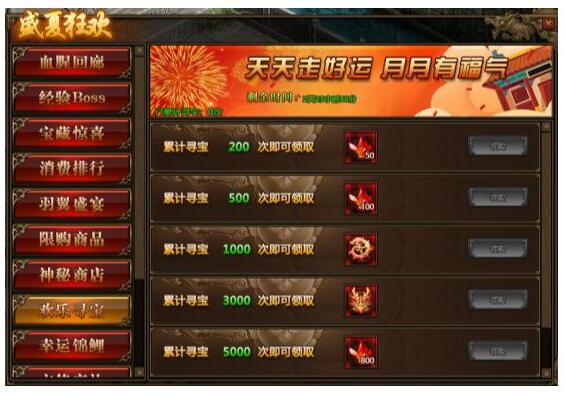 1.活动期间,玩家累积寻宝次数满足要求,可以领取本职业星石、本职业仙装、传世仙装等相应奖励;