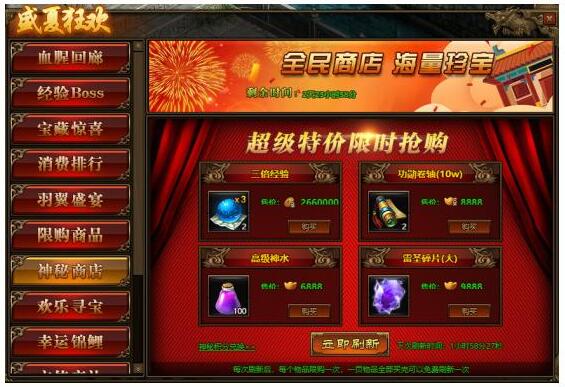 1.活动期间,玩家可在神秘商店中购买商品,商品可用金币,绑元,元宝进行购买;