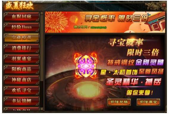 1.活动期间,玩家寻宝概率翻倍,极高几率获得星·太初首饰,传世灵器、传世灵甲,特戒钢纹,仙元石、碧落星空,传世灵器、传世灵甲,金刚灵髓、金刚精华,至尊风扬阵法以及圣灵精华(撼岳)