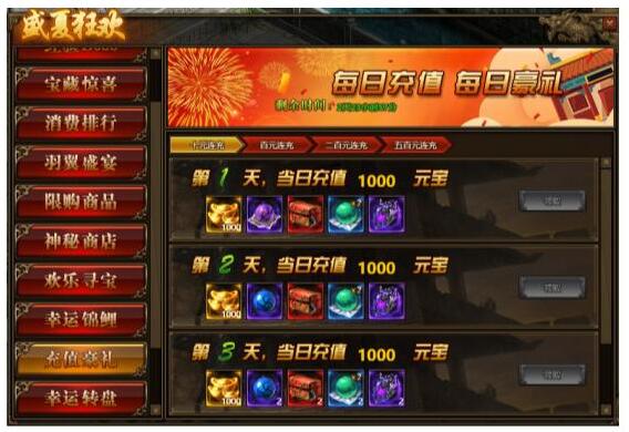 2.连续充值达到3天,奖励翻倍领,更可领取暗影晶石、地狱晶石、随机7级阵法宝珠、雷霆装备等贵重物品