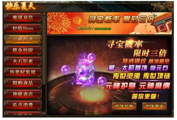 1.活动期间,玩家寻宝概率翻倍,极高几率获得星·太初首饰,特戒钢纹、仙元石、碧落星空,传世灵器、传世灵甲,传世灵器·手镯碎片、传世灵器·项链碎片,元神麻痹特戒以及元神护身特戒