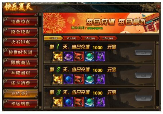 2.连续充值达到3天,奖励翻倍领,更可领取暗影晶石、地狱晶石、随机阵法宝珠宝箱等贵重物品