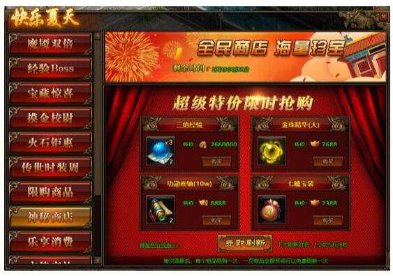 1.活动期间,玩家可在神秘商店中购买商品,商品可用金币,绑元,元宝进行购买;