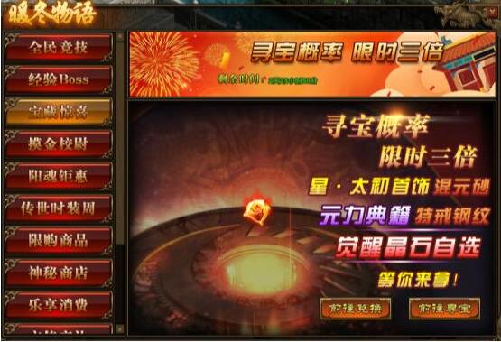 1.活动期间,玩家寻宝概率翻倍,极高几率获得星·太初首饰,传世灵器、传世灵甲,特戒钢纹,混元砂,传世灵器、传世灵甲,不灭意志典籍、元力回响典籍以及觉醒晶石自选宝箱