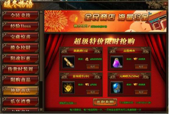 1.活动期间,玩家可在神秘商店中购买商品,商品可用金币,绑元,元宝进行购买;