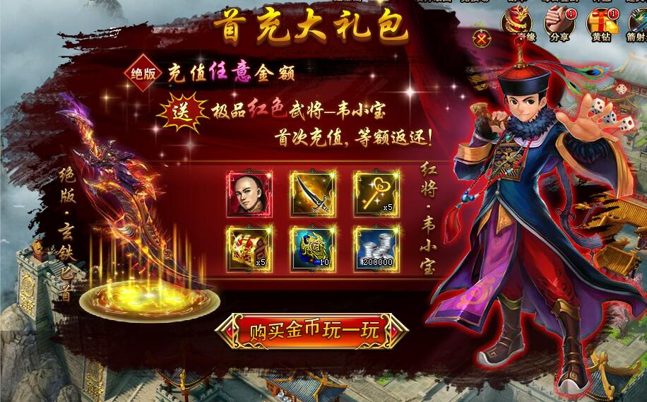 礼包内容: 极品红色武将韦小宝*1 , 玄铁匕首*1 ,金钥匙*5 ,金箱子*1 ,军令*10 ,银币*200000