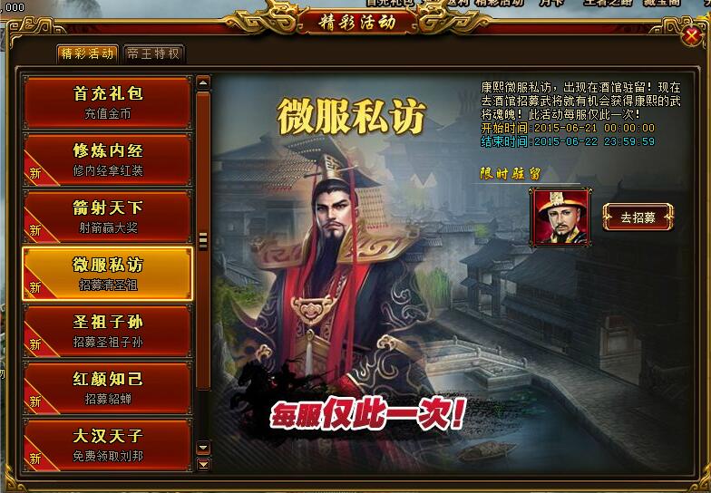 活动内容:康熙微服私访驻留酒馆,玩家到酒馆招募武将,可以活动康熙的武将魂魄!此活动每服仅此一次!