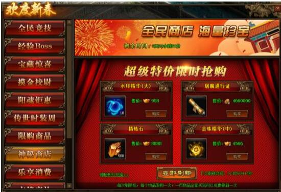 1.活动期间,玩家可在神秘商店中购买商品,商品可用金币,绑元,元宝进行购买;