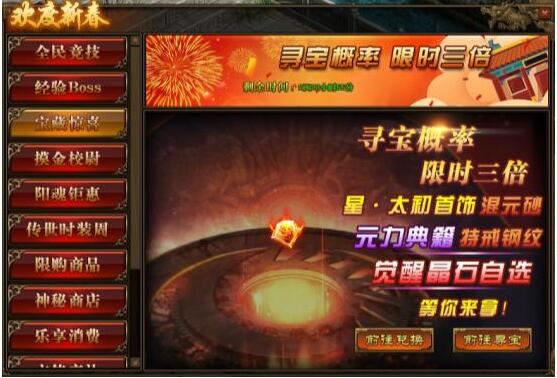 1.活动期间,玩家寻宝概率翻倍,极高几率获得星·太初首饰,传世灵器、传世灵甲,特戒钢纹,混元砂,传世灵器、传世灵甲,不灭意志典籍、元力回响典籍以及觉醒晶石自选宝箱